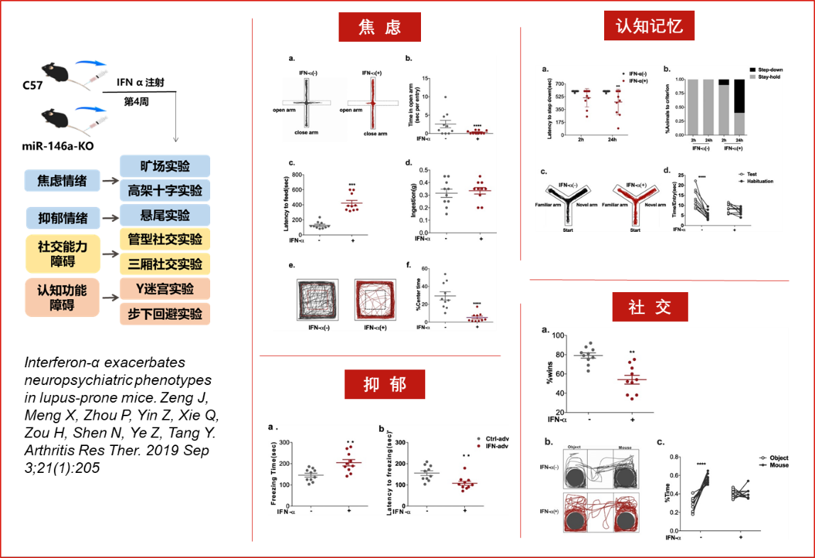 | 焦慮/抑郁情緒障礙 | 慢性不可預知溫和應(yīng)激所致抑郁小鼠模型,行為絕望抑郁模型 | ? 運動和感覺:曠場運動、轉(zhuǎn)棒、Von Frey機械痛、熱板、甩尾 ? 抑郁和焦慮:高架十字、O迷宮、強迫游泳、懸尾、糖水消耗 ? 認知記憶:Y迷宮、新物體識別、水迷宮 ? 社交:三箱社交、社交認知 |