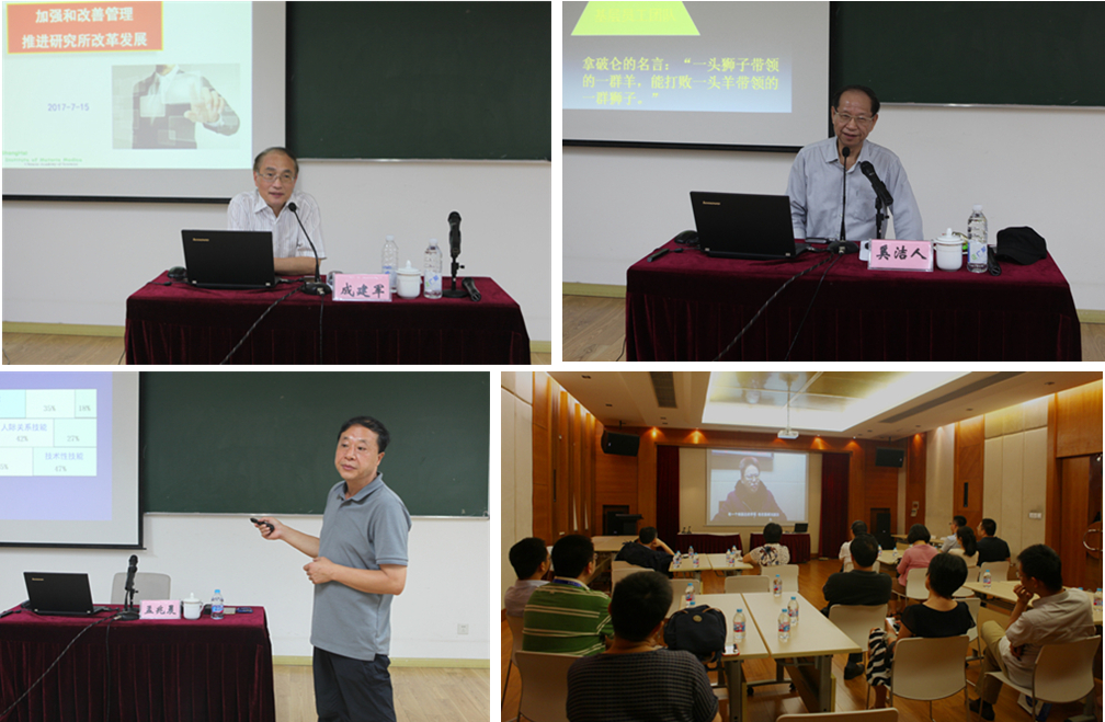 上海分院院長、上海高等研究院黨委書記、上??萍即髮W(xué)黨委書記朱志遠(yuǎn),中國浦東干部學(xué)院原常務(wù)副院長奚潔人,中科院上海藥物研究所原黨委書記成建軍,上??萍脊芾砀刹繉W(xué)院副教授孟兆晨受邀分別做了《上??苿?chuàng)中心建設(shè)的發(fā)展機(jī)遇與挑戰(zhàn)》、《領(lǐng)導(dǎo)力的建設(shè)與提升》、《加強(qiáng)和改善管理 推進(jìn)研究所改革發(fā)展》、《管理理論與藝術(shù)》等主題報(bào)告。