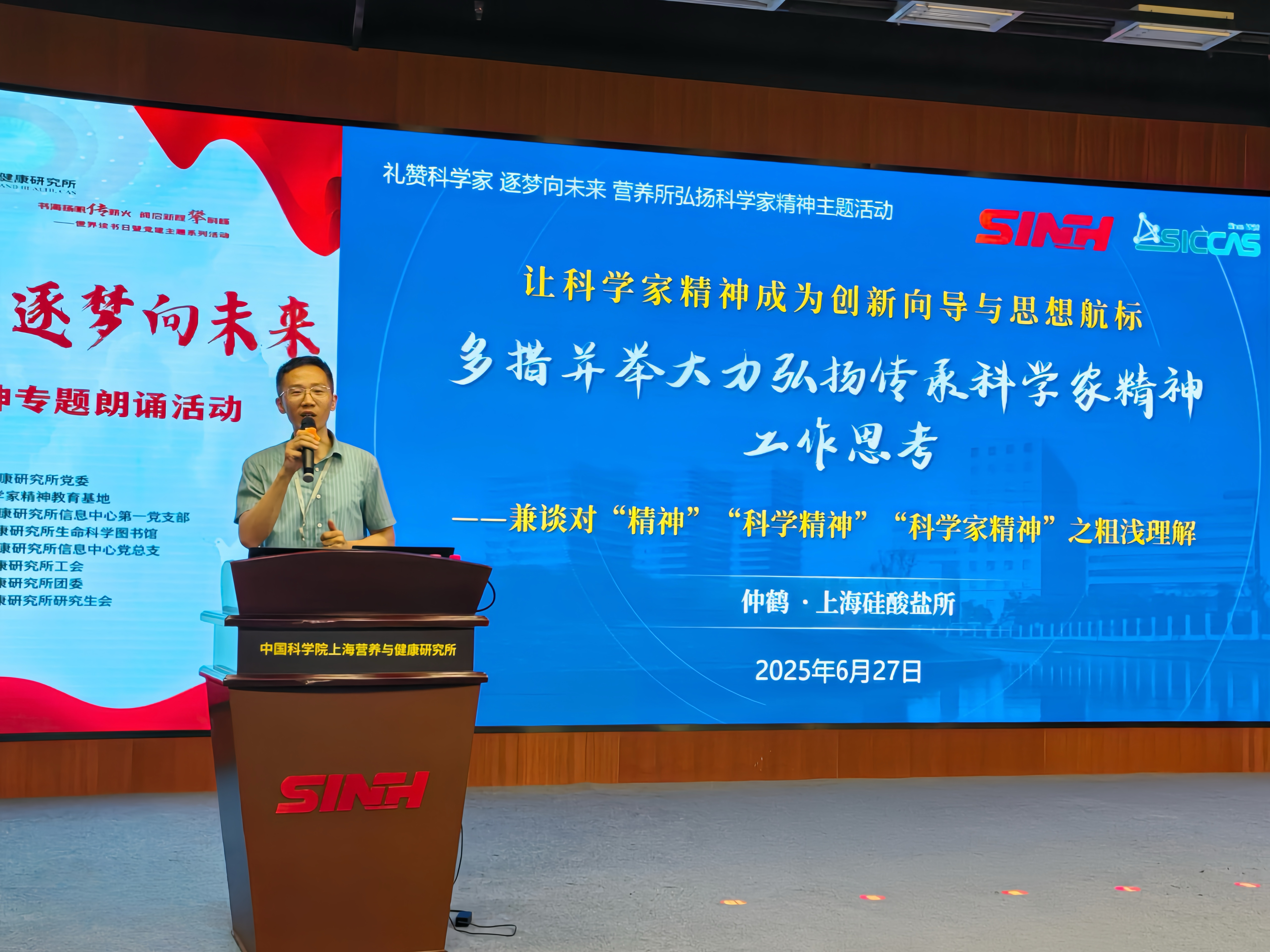 為致敬科學(xué)家,激勵(lì)科技工作者們堅(jiān)定科技報(bào)國信念、勇攀科學(xué)高峰,6月27日下午,中國科學(xué)院上海營養(yǎng)與健康研究所舉行弘揚(yáng)科學(xué)家精神專題朗誦活動(dòng)。信息中心副主任、黨總支副書記沈東婧主持活動(dòng)。