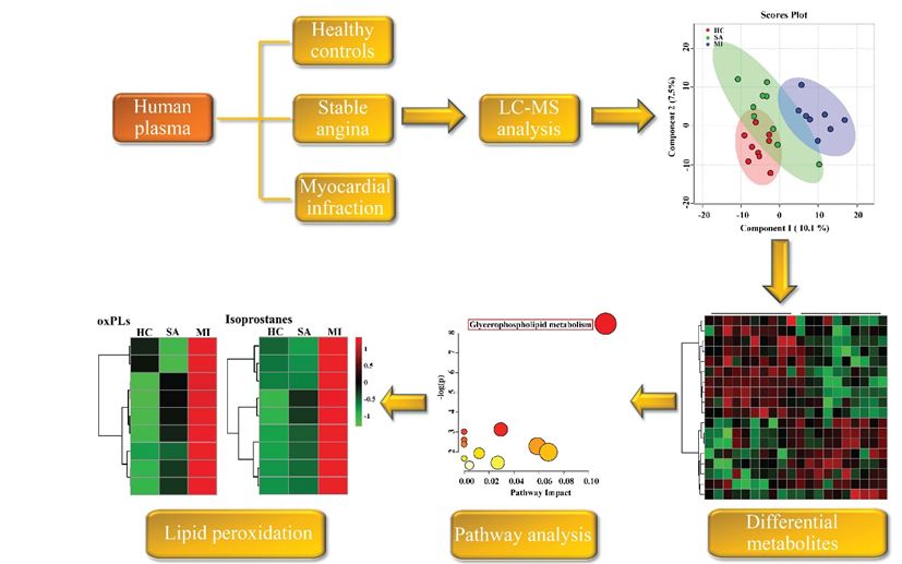 圖:利用代謝組學(xué)、脂質(zhì)組學(xué)研究不同階段冠心病病人血漿代謝變化的流程圖。