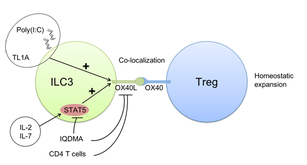 腸道炎癥性疾病嚴重威脅人類健康,Treg是控制疾病發(fā)展的重要細胞類型之一。Treg高表達OX40(OX40L的受體),OX40已經被證明對Treg的擴增、存活和記憶都具有重要作用。OX40L過去被報導主要表達在抗原提呈細胞上,小鼠脾臟淋巴組織誘導細胞(lymphoid tisssue inducer, Lti)組成型表達OX40L,小鼠腦膜和人扁桃體中也發(fā)現了OX40L+ ILC3的存在。ILC3是固有免疫細胞的一個亞群,參與機體對抗腸道細菌感染、調控慢性炎癥和組織修復。ILC3與T細胞的相互作用廣泛存在,腸道ILC3是否表達OX40L,以及是否通過OX40L對腸道Treg產生影響,這些問題目前并沒有被報導。
