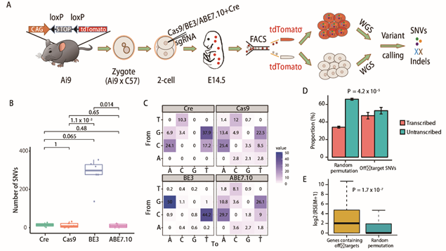 (A)實(shí)驗(yàn)流程?(B)脫靶位點(diǎn)數(shù)目比較。Cre-, Cas9-, BE3- and ABE7.10組分別有14+/-12 (SEM, n=2),?12+/-4 (SEM, n=11),?283+/-32 (SEM, n=6)和10 +/- 5 (SEM, n = 4)個SNVs?(C)突變類型的分布比較。每個格子中的數(shù)字表示該種突變類型占全部突變的比例 (D)脫靶SNVs富集在基因組中的轉(zhuǎn)錄區(qū)域?(E)Genes包含脫靶位點(diǎn)的基因在細(xì)胞胚胎中有更高的表達(dá)量。