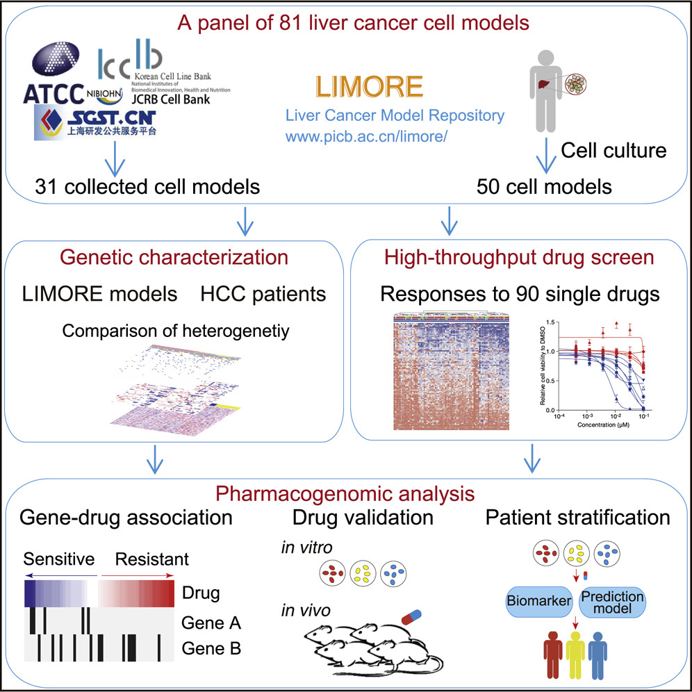 2019年8月1日,國(guó)際著名學(xué)術(shù)期刊Cancer Cell在線發(fā)表了中國(guó)科學(xué)院生物化學(xué)與細(xì)胞生物學(xué)研究所惠利健研究組、中國(guó)科學(xué)院上海營(yíng)養(yǎng)與健康研究所李亦學(xué)研究組、第二軍醫(yī)大學(xué)附屬東方肝膽外科醫(yī)院張海斌研究組以及南京大學(xué)醫(yī)學(xué)院附屬鼓樓醫(yī)院施曉雷合作的題為“A Pharmacogenomic Landscape in Human Liver Cancers”的研究論文。該工作報(bào)道了目前最大的肝癌細(xì)胞模型平臺(tái)和最詳細(xì)的肝癌細(xì)胞藥物基因組學(xué)。通過(guò)整合大規(guī)模測(cè)序和高通量藥物篩選數(shù)據(jù),研究人員建立了肝癌中基因組變異與藥物響應(yīng)的相關(guān)性,發(fā)現(xiàn)了新的治療靶點(diǎn)和分子標(biāo)志物(圖1)。
