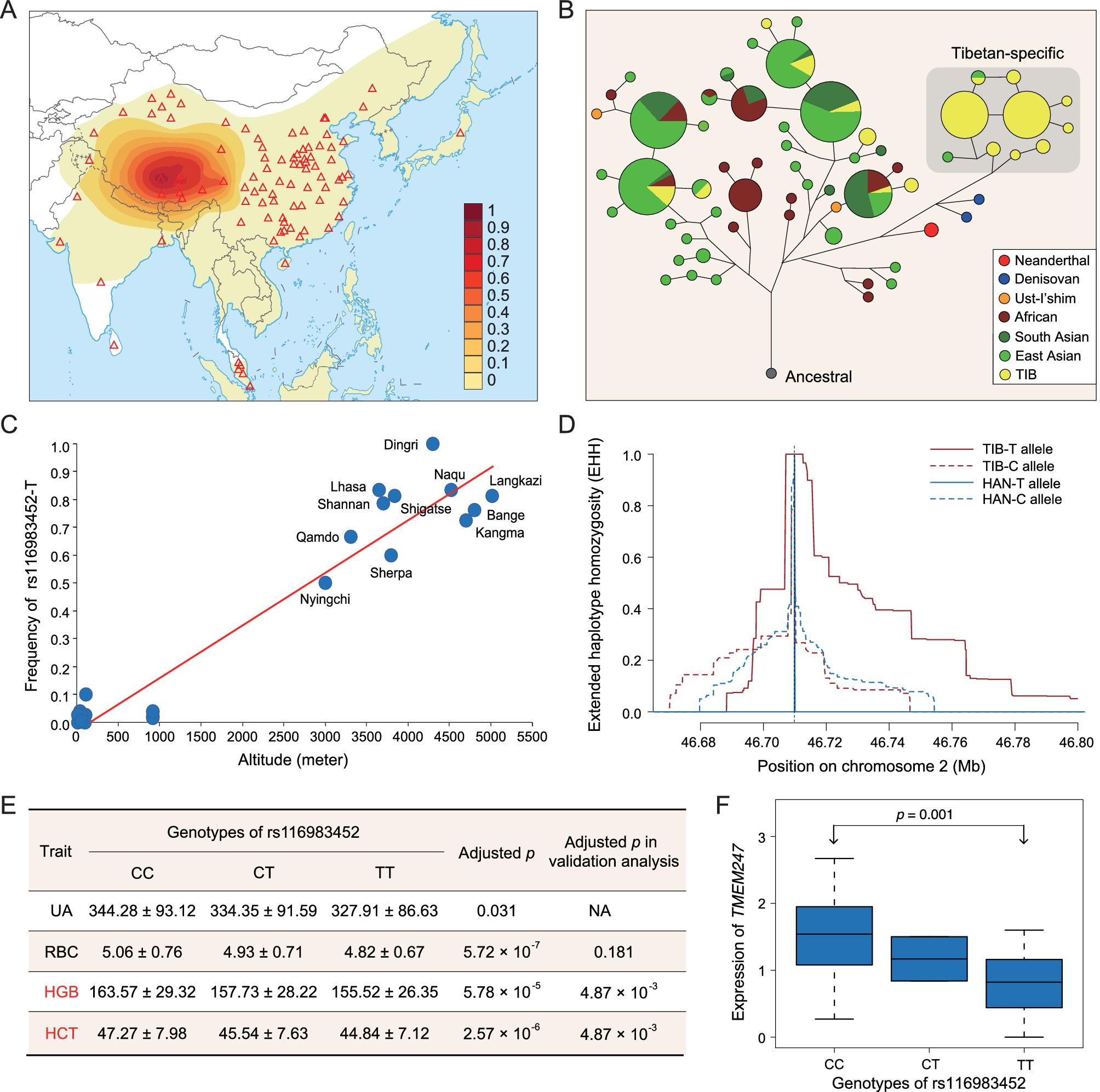圖:藏族人群適應(yīng)性變異TMEM247-rs116983452-T的群體遺傳解析和功能統(tǒng)計學(xué)分析