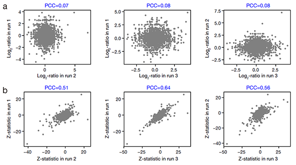 同位素標(biāo)記定量蛋白質(zhì)組數(shù)據(jù)長期存在比率壓縮的難題。研究人員使用MAP模型分別比較分析了三個批次產(chǎn)生的小鼠胚胎干細(xì)胞分化前后蛋白質(zhì)組數(shù)據(jù),發(fā)現(xiàn)蛋白質(zhì)iTRAQ信號log2比率在不同批次間關(guān)聯(lián)很低(圖二a),可能是因為技術(shù)誤差對其貢獻(xiàn)所服從的正態(tài)分布N(0, σ2)在批次間各不相同。根據(jù)MAP模型,研究人員提出使用每個批次的全局誤差函數(shù)對其中每個蛋白質(zhì)iTRAQ信號的log2比率進(jìn)行重標(biāo)度(rescaling),使得在不同批次中技術(shù)誤差對其貢獻(xiàn)均服從標(biāo)準(zhǔn)正態(tài)分布N(0, 1),從而發(fā)展了一個新的Z統(tǒng)計量。比較不同批次蛋白質(zhì)Z統(tǒng)計量之間的關(guān)聯(lián),可以發(fā)現(xiàn)它具有明顯更好的可重復(fù)性(圖二b)。