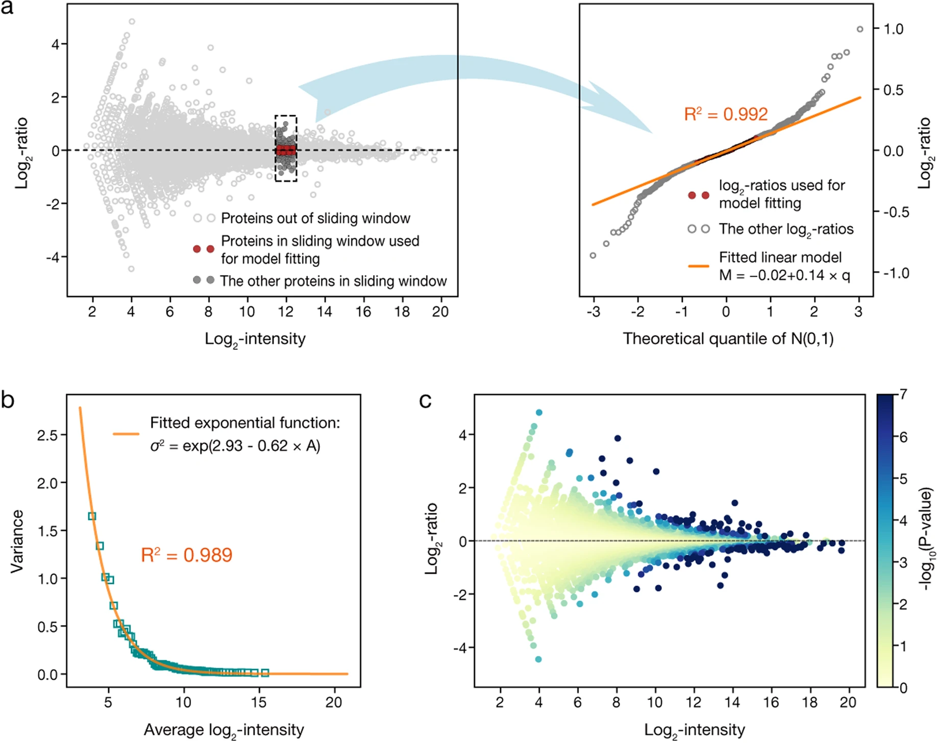 (a)局域線性擬合;(b)全局指數(shù)擬合構(gòu)建技術(shù)誤差模型;(c)計算每個蛋白質(zhì)信號差異的顯著性P值。