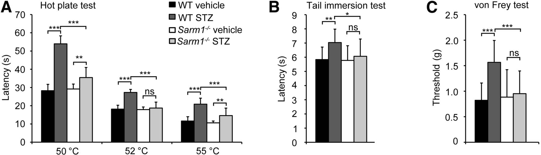 圖:Sarm1基因的敲除可以緩解糖尿病小鼠的痛覺不敏感現(xiàn)象