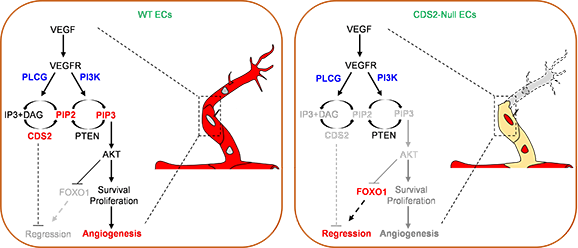 2019年9月9日,國際學(xué)術(shù)期刊Cell Research在線發(fā)表了潘巍峻研究組題為“Endothelial CDS2 Deficiency Causes VEGFA-mediated Vascular Regression and Tumor Inhibition”的研究論文,該工作首次揭示了VEGFA (Vascular endothelial growth factor-A)信號通路的功能存在兩面性,即,VEGFA既可以促進血管新生也可以誘導(dǎo)血管退化,這一過程受CDS2 (CDP-diacylglycerol synthetase-2)控制的磷脂酰肌醇代謝循環(huán)調(diào)控。內(nèi)皮細胞CDS2缺失能夠?qū)EGFA信號通路的功能從促進血管新生轉(zhuǎn)變?yōu)檎T導(dǎo)血管退化,并通過腫瘤自身分泌的VEGFA達到抑制腫瘤生長的目的。