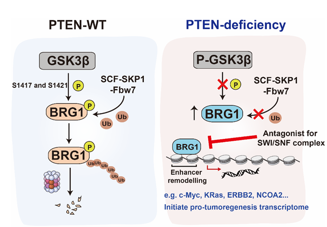 PTEN缺失以及由此導(dǎo)致的AKT信號(hào)通路的過度激活是導(dǎo)致前列腺癌發(fā)生發(fā)展的重要原因之一。然而PTEN在患者中低表達(dá)或者失活因而無法直接靶向用藥;同時(shí)目前臨床上針對(duì)PI3K-AKT信號(hào)通路的靶向藥效果并不理想。因此本課題希望發(fā)現(xiàn)潛在的治療靶點(diǎn)實(shí)現(xiàn)對(duì)PTEN缺失前列腺癌的有效治療。鑒于PTEN缺失會(huì)導(dǎo)致細(xì)胞特定表觀遺傳因子異常改變,我們通過表觀遺傳因子篩選的方法發(fā)現(xiàn)在PTEN缺失前列腺腫瘤細(xì)胞中抑制BRG1可以導(dǎo)致前列腺腫瘤細(xì)胞的協(xié)同致死。轉(zhuǎn)基因小鼠和類器官培養(yǎng)模型的結(jié)果證明PTEN缺失前列腺腫瘤細(xì)胞對(duì)于BRG1的特異性依賴。分子機(jī)制的研究揭示了PTEN缺失可以通過抑制AKT-GSK3β-FBXW7通路增強(qiáng)BRG1的蛋白穩(wěn)定性,上調(diào)BRG1的表達(dá)。在PTEN缺失前列腺腫瘤細(xì)胞中,BRG1進(jìn)而重塑染色質(zhì)構(gòu)象,開啟一系列基因的表達(dá),造成腫瘤細(xì)胞對(duì)BRG1的高度依賴。因此使用BRG1抑制劑可以特異性抑制PTEN缺失前列腺腫瘤的進(jìn)展。
