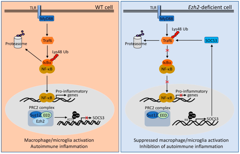 ????在本研究中,博士研究生張興利等在肖意傳和秦駿研究員的共同指導(dǎo)下,利用遺傳小鼠模型揭示了Ezh2在巨噬細(xì)胞與小膠質(zhì)細(xì)胞中通過(guò)靶向抑制抗炎癥性基因Socs3的表達(dá),進(jìn)而介導(dǎo)了巨噬細(xì)胞與小膠質(zhì)細(xì)胞在炎癥部位的活化,由此促進(jìn)了炎癥性腸炎與實(shí)驗(yàn)性自身免疫性腦脊髓炎的發(fā)病。當(dāng)利用Ezh2選擇性抑制劑GSK126抑制H3K27me3,或當(dāng)Ezh2在髓系來(lái)源的細(xì)胞中特異性敲除后,骨髓來(lái)源的巨噬細(xì)胞與小膠質(zhì)細(xì)胞的炎癥性活化受到了顯著抑制,相應(yīng)自身免疫性疾病的發(fā)病也得到了緩解。進(jìn)一步分子機(jī)制研究發(fā)現(xiàn),Ezh2特異性的靶向Socs3基因的啟動(dòng)子區(qū)域,促進(jìn)了相關(guān)區(qū)域H3K27me3的表達(dá),由此抑制了抗炎基因Socs3的表達(dá)。因此,?Ezh2缺失會(huì)顯著促進(jìn)Socs3基因的表達(dá),大量產(chǎn)生的Socs3又介導(dǎo)了Traf6的泛素化降解作用,并進(jìn)一步抑制了下游NF-κB信號(hào)通路的活化與促炎癥基因的表達(dá)(下圖)。有意思的是,多發(fā)性硬化病人腦部基因表達(dá)譜數(shù)據(jù)表明,EZH2在病人腦組織中的表達(dá)相較正常人腦組織的表達(dá)有明顯升高的趨勢(shì),提示EZH2可能介導(dǎo)了多發(fā)性硬化病理過(guò)程中小膠質(zhì)細(xì)胞的炎癥性活化,并參與了疾病的發(fā)生發(fā)展,因此其可作為一個(gè)潛在的自身免疫性疾病的治療靶標(biāo)。
