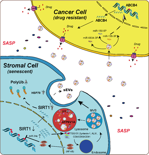 研究人員發(fā)現(xiàn),同機(jī)體正常細(xì)胞相比,衰老基質(zhì)細(xì)胞釋放的小胞外囊泡數(shù)量、粒徑和分布范圍均發(fā)生深刻改變。衰老細(xì)胞中被動激活的轉(zhuǎn)錄機(jī)器NF-κB在驅(qū)動大量SASP因子產(chǎn)生的同時(shí),也下調(diào)了NAD+-依賴性去乙酰化酶SIRT1這一抗衰老蛋白的表達(dá)。伴隨SIRT1漸進(jìn)性衰退的,則是全蛋白組泛素化水平的明顯上升。與此同時(shí),多亞基液泡H+-ATPase(V-ATPase)的催化亞基A(ATP6V1A)表達(dá)降低,造成衰老細(xì)胞溶酶體酸性化(acidification)功能失衡,最終導(dǎo)致小胞外囊泡的胞內(nèi)合成與胞外釋放大幅增加。在SIRT1激活劑SRT2104(或SRT1720)的作用下,衰老基質(zhì)細(xì)胞合成胞外囊泡的能力被顯著控制。在腫瘤微環(huán)境中,衰老細(xì)胞的胞外囊泡能夠改變癌細(xì)胞的表達(dá)譜,包括以磷脂酰膽堿為底物的p-糖蛋白轉(zhuǎn)運(yùn)家族成員ABCB4表達(dá)上調(diào),而其所涉及的藥物外排泵活性隨之上升。癌細(xì)胞的這一變化促成了其自身對化療藥物的顯著抵抗,而敲除ABCB4或使用SRT2104則能有效降低衰老基質(zhì)細(xì)胞小胞外囊泡賦予微環(huán)境中癌細(xì)胞的這種獲得性耐藥的潛力。
