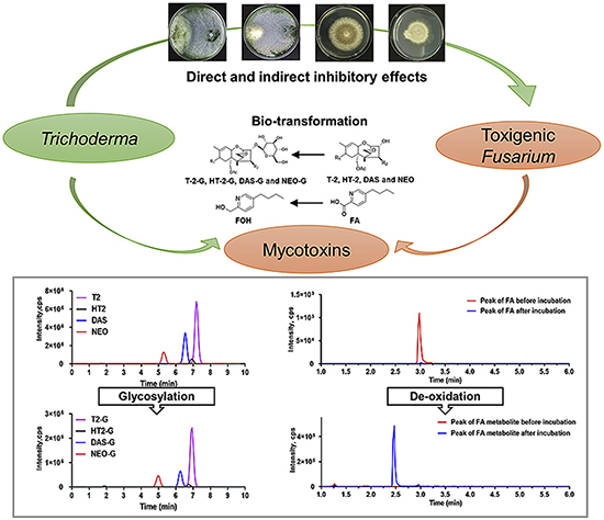 2020年9月1日,國際學(xué)術(shù)期刊Environmental Pollution在線發(fā)表了中科院上海營養(yǎng)與健康研究所武愛波研究組題為“Confrontation assays and mycotoxin treatment reveal antagonistic activities of Trichoderma and the fate of Fusarium mycotoxins in microbial interaction”的研究論文。該研究報道了生防木霉在與不同類型產(chǎn)毒真菌互作過程中,能夠通過糖基化和去氧化實(shí)現(xiàn)對不同類型真菌毒素的脫毒轉(zhuǎn)化,為發(fā)展基于木霉的真菌毒素源頭防控提出了新的路徑。同時,從毒素轉(zhuǎn)化角度探討了木霉與產(chǎn)毒真菌的互作關(guān)系,為真菌毒素污染的安全控制提供了新思路。
