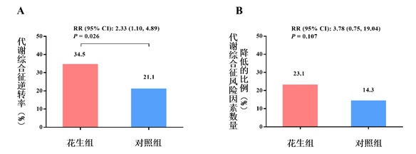 (A)代謝綜合征志愿者的代謝綜合征逆轉率(即干預前符合IDF中國人的標準定義的代謝綜合征志愿者在12周干預后不再符合此標準的比例)(花生組,n = 87;對照組,n = 76)。(B)高風險個體的代謝綜合征風險因素數量降低的比例(花生組,n = 26;對照組,n = 35)。RR:相對危險度。