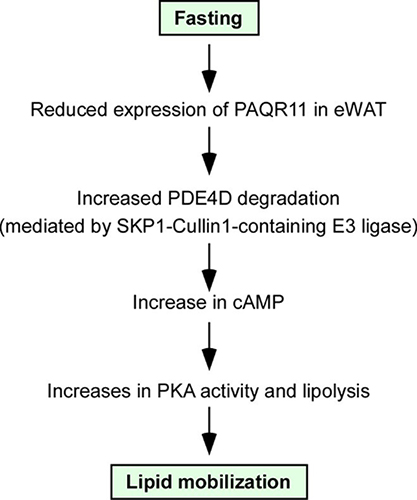 陳雁研究組博士研究生黃美琴和林毅君等人發(fā)現(xiàn)高爾基體結(jié)構(gòu)蛋白PAQR11在脂肪組織中的表達(dá)量很高。在對構(gòu)建的PAQR11敲除小鼠研究中,發(fā)現(xiàn)敲除小鼠能夠?qū)垢咧嬍痴T導(dǎo)的肥胖,并且內(nèi)臟脂肪部位有顯著的脂肪分解水平的上升。進(jìn)一步的研究發(fā)現(xiàn),PAQR11的缺失能夠?qū)е铝姿岫ッ窹DE4D的蛋白降解,從而激活了PKA誘導(dǎo)的脂肪分解途徑。隨后研究人員又在細(xì)胞水平上證明PAQR11是通過結(jié)合SKP1-CUL1-FBXO2復(fù)合體來調(diào)節(jié)PDE4D的泛素化,維持其蛋白穩(wěn)定性。該工作首次揭示了高爾基體蛋白PAQR11能夠調(diào)節(jié)蛋白泛素化、并且影響到脂肪細(xì)胞代謝狀態(tài)。該研究豐富了對于脂肪分解代謝調(diào)控的分子機(jī)制的認(rèn)識,并且闡明了通過對脂肪分解的調(diào)控能夠影響機(jī)體的肥胖狀態(tài),為促進(jìn)肥胖治療提供了新的靶點。