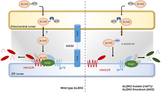 在本研究中,研究人員首先在ALDH2基因敲除以及rs671敲入小鼠中觀察到即使喂養(yǎng)普通食物也引起肝臟和血清中總膽固醇和低密度脂蛋白水平的升高。接著,利用代謝組學(xué)和代謝流分析發(fā)現(xiàn)ALDH2基因敲除小鼠膽固醇合成增加;小鼠膽固醇水平的升高可以被他汀類(lèi)藥物抑制,提示ALDH2可能參與調(diào)控膽固醇合成酶HMGCR。在細(xì)胞實(shí)驗(yàn)中, 研究人員發(fā)現(xiàn)ALDH2直接影響HMGCR的泛素化降解:ALDH2促進(jìn)HMGCR與Insig1/SCAP/gp78的相互作用,抑制膽固醇合成,這種作用在ALDH2突變體中顯著減弱。進(jìn)一步的機(jī)制研究顯示,在膽固醇升高時(shí),線粒體的ALDH2通過(guò)線粒體與內(nèi)質(zhì)網(wǎng)接觸的膜結(jié)構(gòu)(Mitochondria-Associated membrane with ER, MAM)轉(zhuǎn)移至內(nèi)質(zhì)網(wǎng),促進(jìn)HMGCR的泛素化降解。在ALDH2基因敲除或者rs671敲入模型中,HMGCR的蛋白穩(wěn)定性增加從而促進(jìn)膽固醇合成(如圖所示)。該研究發(fā)現(xiàn)了一個(gè)膽固醇代謝調(diào)控的新機(jī)制,同時(shí)提示在ALDH2突變?nèi)巳盒难芗膊〉娘L(fēng)險(xiǎn)增加可能與膽固醇代謝失調(diào)有關(guān);臨床降膽固醇藥物他汀可以有效抑制膽固醇水平的升高。