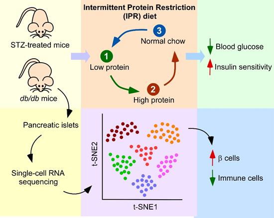 雖然持續(xù)的蛋白質(zhì)或者氨基酸限制以及間歇性節(jié)食已被證明可以改善糖尿病,但目前還沒有研究探討間歇性的蛋白限制是否足以干預糖尿病。該項研究探討了一種間歇性蛋白限制(IPR)的飲食方式,發(fā)現(xiàn)IPR可以迅速緩解STZ誘導的1型糖尿病小鼠以及瘦素受體缺陷導致的2型糖尿病小鼠的高血糖血癥。針對小鼠胰島的進一步研究發(fā)現(xiàn)IPR可以增加胰島β細胞數(shù)量、促進β細胞增殖、并改善β細胞功能。在外周組織中,IPR可以減少肝臟的糖異生并提高骨骼肌的胰島素敏感性。與持續(xù)性低蛋白飲食相比,IPR對于糖尿病小鼠的肝臟脂肪積累和損傷更輕。此外,通過小鼠胰島單細胞測序分析發(fā)現(xiàn)了IPR可以逆轉(zhuǎn)糖尿病導致的胰島β細胞數(shù)量的減少以及胰島免疫細胞的浸潤。由于IPR這一飲食方式能夠有效控制血糖并保護胰島β細胞,比禁食或熱量限制可能更容易被人接受,并避免了持續(xù)性蛋白限制的不良作用,故IPR在未來有較大的應用轉(zhuǎn)化潛力。