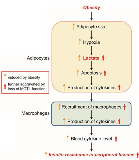 陳雁研究組對脂肪細胞高表達的單羧酸轉(zhuǎn)運蛋白MCT1進行研究,這是體內(nèi)最主要的乳酸轉(zhuǎn)運蛋白。通過構(gòu)建了脂肪組織特異性敲除MCT1的小鼠、以及利用細胞水平上的研究,發(fā)現(xiàn)脂肪組織中MCT1主要介導細胞乳酸的外排。敲除MCT1的小鼠在高脂飲食誘導的肥胖模型中不會顯著影響體重,但是小鼠發(fā)生了更嚴重的胰島素抵抗。對該表型進一步的研究發(fā)現(xiàn),敲除MCT1會導致脂肪組織的促炎巨噬細胞的浸潤增加,最終導致肥胖小鼠發(fā)生嚴重的系統(tǒng)性炎癥。分子機制研究發(fā)現(xiàn),MCT1敲除導致脂肪細胞中乳酸累積增加,脂肪細胞的凋亡信號被激活,并影響到脂肪細胞分泌的炎性細胞因子。分泌的炎癥因子募集了巨噬細胞并通過巨噬細胞進一步放大了炎癥信號,最終加重全身的胰島素抵抗。
