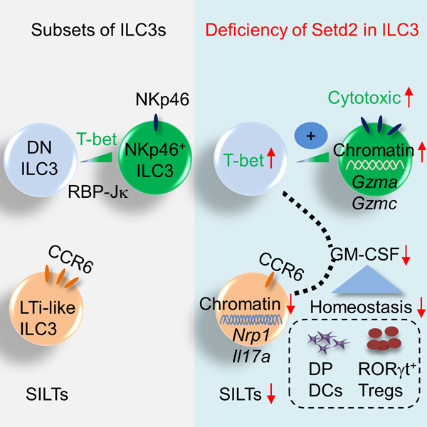 本研究發(fā)現(xiàn)Setd2可以維持小鼠腸道ILC3的自穩(wěn)態(tài)并對(duì)ILC3的亞群分布和功能有調(diào)控作用,進(jìn)而影響RORγt+調(diào)節(jié)性T細(xì)胞(Regulatory T cells,Treg)和腸道免疫應(yīng)答。Setd2的缺失會(huì)導(dǎo)致總ILC3細(xì)胞自身豐度的減少,同時(shí)NKp46+ILC3亞群會(huì)呈現(xiàn)比例增加,且高表達(dá)細(xì)胞毒性相關(guān)分子(主要為Granzyme A和Granzyme C),且在體內(nèi)抑制黑色素瘤的生長(zhǎng)。另一方面,Setd2缺失的CCR6+ILC3亞群呈現(xiàn)細(xì)胞數(shù)減少和功能下降,同時(shí)伴隨腸道孤立腸淋巴組織(Solitary intestinal lymphoid tissue,SILT)形成缺陷。適應(yīng)性免疫系統(tǒng)重建實(shí)驗(yàn)發(fā)現(xiàn)在ILC3中特異性缺失Setd2的Rag1-/-小鼠易感于腸道炎癥并伴隨RORγt+Treg的穩(wěn)態(tài)維持缺陷。Treg是具有免疫抑制功能的輔助性T細(xì)胞亞群,腸道中較為富集的、可由腸道微生物誘導(dǎo)產(chǎn)生的RORγt+Treg是一群高表達(dá)IL-10 、具有免疫抑制功能的Treg亞群,對(duì)抑制腸道炎癥有關(guān)鍵作用。RORγt+Treg的穩(wěn)態(tài)維持缺陷可能是由于Setd2缺陷的NKp46-ILC3分泌GM-CSF降低,繼而導(dǎo)致CD11b+CD103+樹突狀細(xì)胞(Dendritic cell,DC)減少導(dǎo)致的。研究人員進(jìn)一步通過ATAC-seq的手段發(fā)現(xiàn)Setd2可通過影響ILC3亞群的染色質(zhì)可及性從而調(diào)控基因表達(dá)。該工作初步探索、關(guān)聯(lián)了調(diào)控ILC3亞群分化和功能的表觀機(jī)制和轉(zhuǎn)錄機(jī)制。