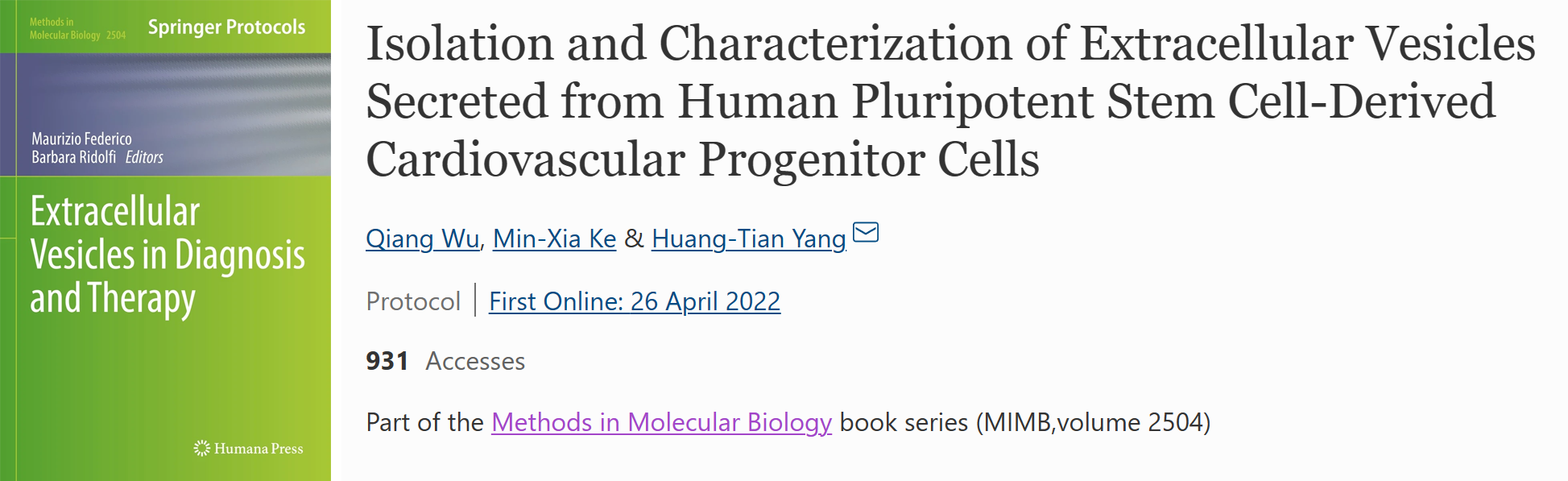 2022年4月26日,Springer Nature出版的Methods in Molecular Biology系列叢書Extracellular Vesicles in Diagnosis and Therapy在線發(fā)表了中國科學(xué)院上海營養(yǎng)與健康研究所楊黃恬研究組題為“Isolation and Characterization of Extracellular Vesicles Secreted from Human Pluripotent Stem Cell-Derived Cardiovascular Progenitor Cells”的工作。該工作介紹了從人多能干細胞源心血管前體細胞(hPSC-CVPCs)條件培養(yǎng)基中高效分離細胞外囊泡(EVs)及其特征鑒定的方法。