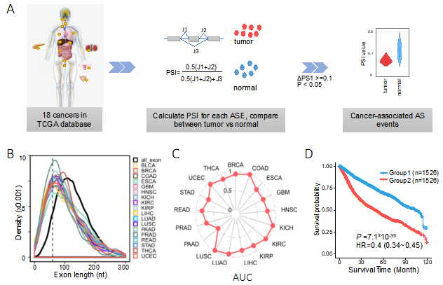 圖注:A.基于TCGA數(shù)據(jù)庫中18種癌癥鑒定癌癥相關(guān)的剪接事件流程。B.所有人類外顯子和每種癌癥類型中異常剪接外顯子的長(zhǎng)度分布圖。C.利用剪接建立隨機(jī)森林模型在每種癌癥類型中的AUC值。D.基于CASE評(píng)估的風(fēng)險(xiǎn)因子進(jìn)行分組的癌癥患者的Kaplan-Meier曲線。