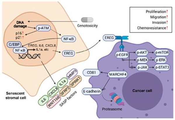 該研究通過對人類原代基質(zhì)細胞進行基于結(jié)合當前臨床化療脅迫壓力的體外藥物模擬處理,確認了epiregulin (EREG)在DNA損傷類型的衰老誘導(dǎo)條件下顯著表達上調(diào),而過往尚未有報道該因子與微環(huán)境中衰老細胞之間存在關(guān)聯(lián)。同時,對臨床前列腺癌及乳腺癌患者化療前后癌癥樣本的分析,也發(fā)現(xiàn)EREG在衰老的癌旁基質(zhì)細胞中顯著上調(diào)表達。機制上,DNA損傷導(dǎo)致基質(zhì)細胞中轉(zhuǎn)錄因子NF-κB等發(fā)生核轉(zhuǎn)位并結(jié)合在EREG啟動子區(qū)多個位點,進而促進EREG在細胞衰老后表達上調(diào)。同時,研究人員也注意到其他衰老相關(guān)因素包括:轉(zhuǎn)錄因子C/EBP激活,DNA空間開放度變化及表觀遺傳修飾改變對EREG轉(zhuǎn)錄起到促進作用。