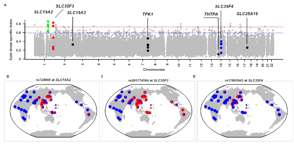 該研究首先依據(jù)對3823個(gè)全球人群的全基因組測序數(shù)據(jù)的分析,發(fā)現(xiàn)了在維生素B1代謝通路涉及的7個(gè)編碼蛋白質(zhì)的基因中有3個(gè)基因(SLC19A2, SLC35F3, SLC35F43)在東亞人群和其他大洲人群有極顯著的差異(圖1);如有些基因單倍型在東亞人群達(dá)到極高頻,而在非洲人群中完全缺失,在歐洲人群中缺失或頻率極低,提示這些基因的單倍型在東亞人群中是特異性存在,進(jìn)一步分析表明這些基因在東亞人群演化歷史中經(jīng)受過正向自然選擇。
