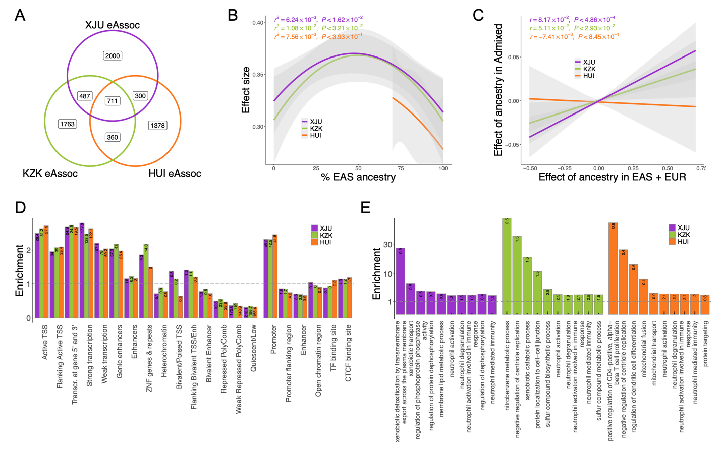 中國西北地處歐亞大陸中心,通過河西走廊連通東西,自古便是歐亞大陸上東西方人群的融匯之地。東西方的人口交流在中國西北地區(qū)形成了大量混合人群,也導(dǎo)致了遺傳多樣性水平的抬升。團(tuán)隊早期的研究結(jié)果表明,中國西北地區(qū)的混合人群表現(xiàn)出復(fù)雜且分化的群體歷史和遺傳構(gòu)成。以新疆維吾爾族人群為例,其先祖形成于多次東西方人群的混合,其中兩次顯著的群體融合事件分別發(fā)生在距今約3750和750年前。維吾爾族人群的遺傳成分主要起源于歐亞大陸上東、南、西、北四個方位的已分化的人群,大致可以由現(xiàn)代東亞人(28.8%–46.5%),南亞人(12.0%–19.9%),西歐人(24.9%–36.6%)和西伯利亞人(15.2%–16.8%)來代表。此后,團(tuán)隊又開展了基于新疆維吾爾族人群全基因組測序數(shù)據(jù)的分析工作,系統(tǒng)性地研究了“人群混合的效應(yīng)”這一基礎(chǔ)性問題,揭示了以遺傳混合為驅(qū)動的人群基因組遺傳多樣性的形成及其表型效應(yīng)。該研究通過結(jié)合基因組與轉(zhuǎn)錄組數(shù)據(jù)對中國西北幾個典型混合人群開展跨人群的比較分析,力圖進(jìn)一步解析人群混合在基因組和轉(zhuǎn)錄組遺傳多樣性層面的影響,以及探討遺傳混合的表型效應(yīng)。