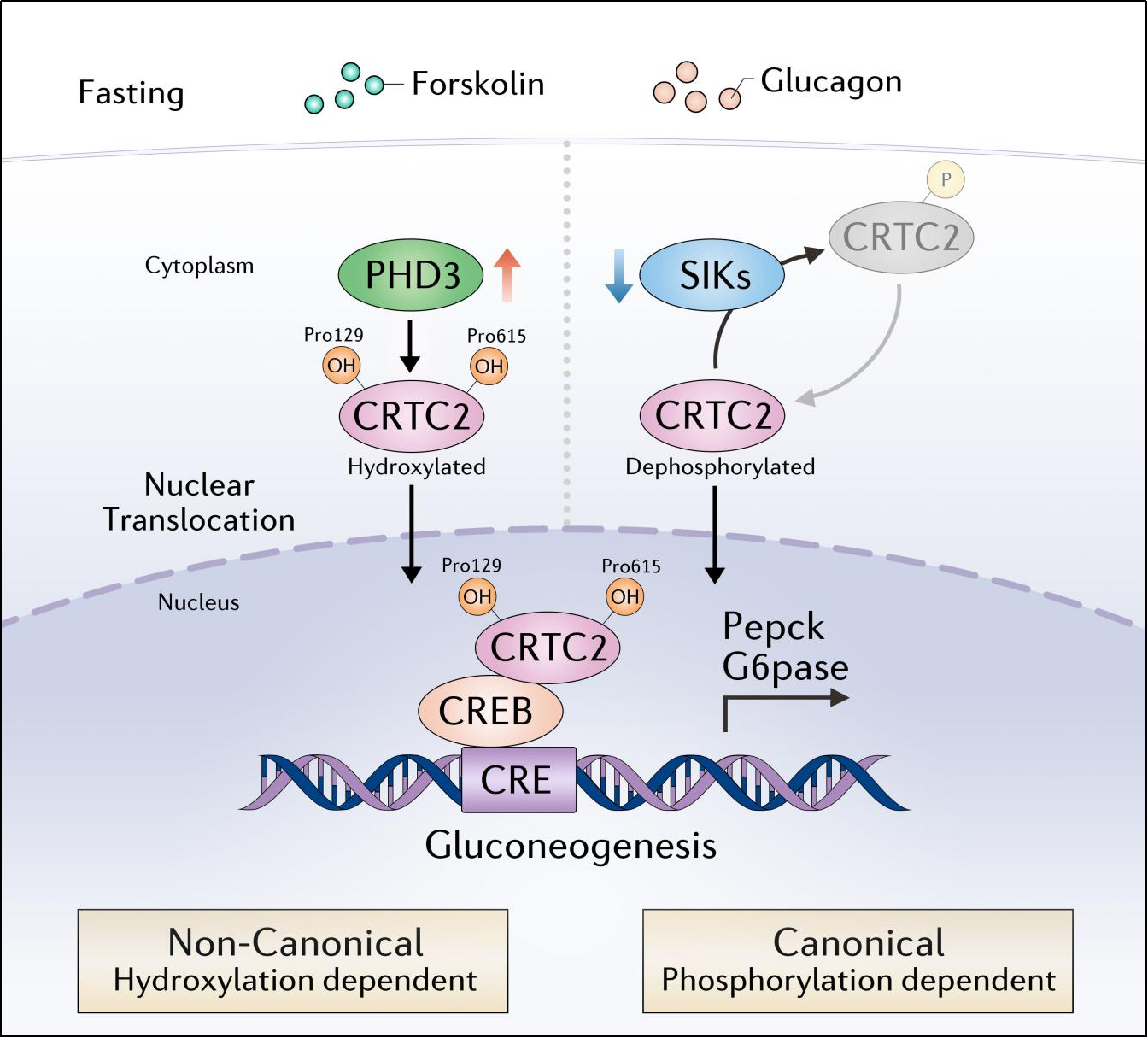 在禁食或胰高血糖素刺激條件下,PHD3結(jié)合并羥基化CRTC2的Pro129和Pro615位點(diǎn),導(dǎo)致CRTC2的核轉(zhuǎn)位和CREB/CRTC2途徑激活,促進(jìn)糖異生基因表達(dá)和肝糖輸出。CRTC2羥基化是一種非經(jīng)典的CRTC2翻譯后修飾,獨(dú)立于經(jīng)典的CRTC2磷酸化修飾對肝臟糖異生的調(diào)控。