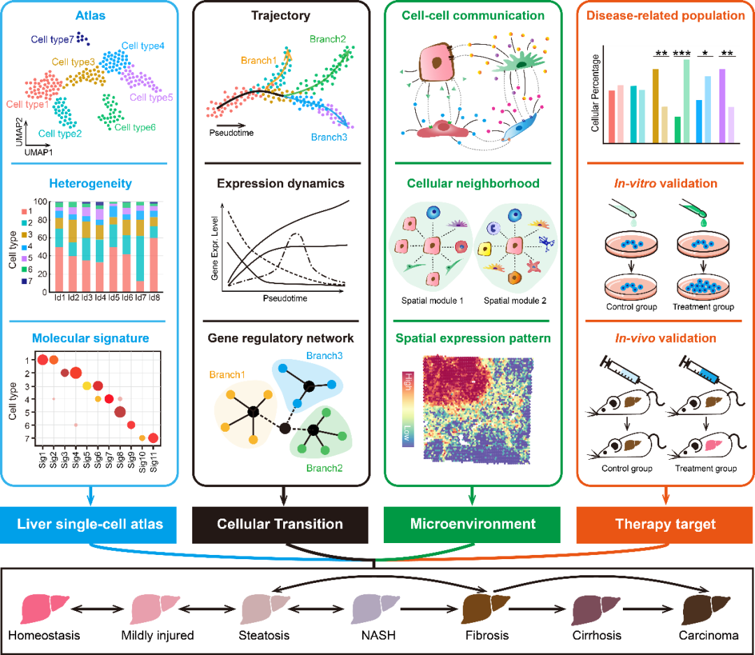 圖1、單細(xì)胞以及空間組學(xué)技術(shù)在肝臟研究中的常見(jiàn)應(yīng)用場(chǎng)景及總體分析思路