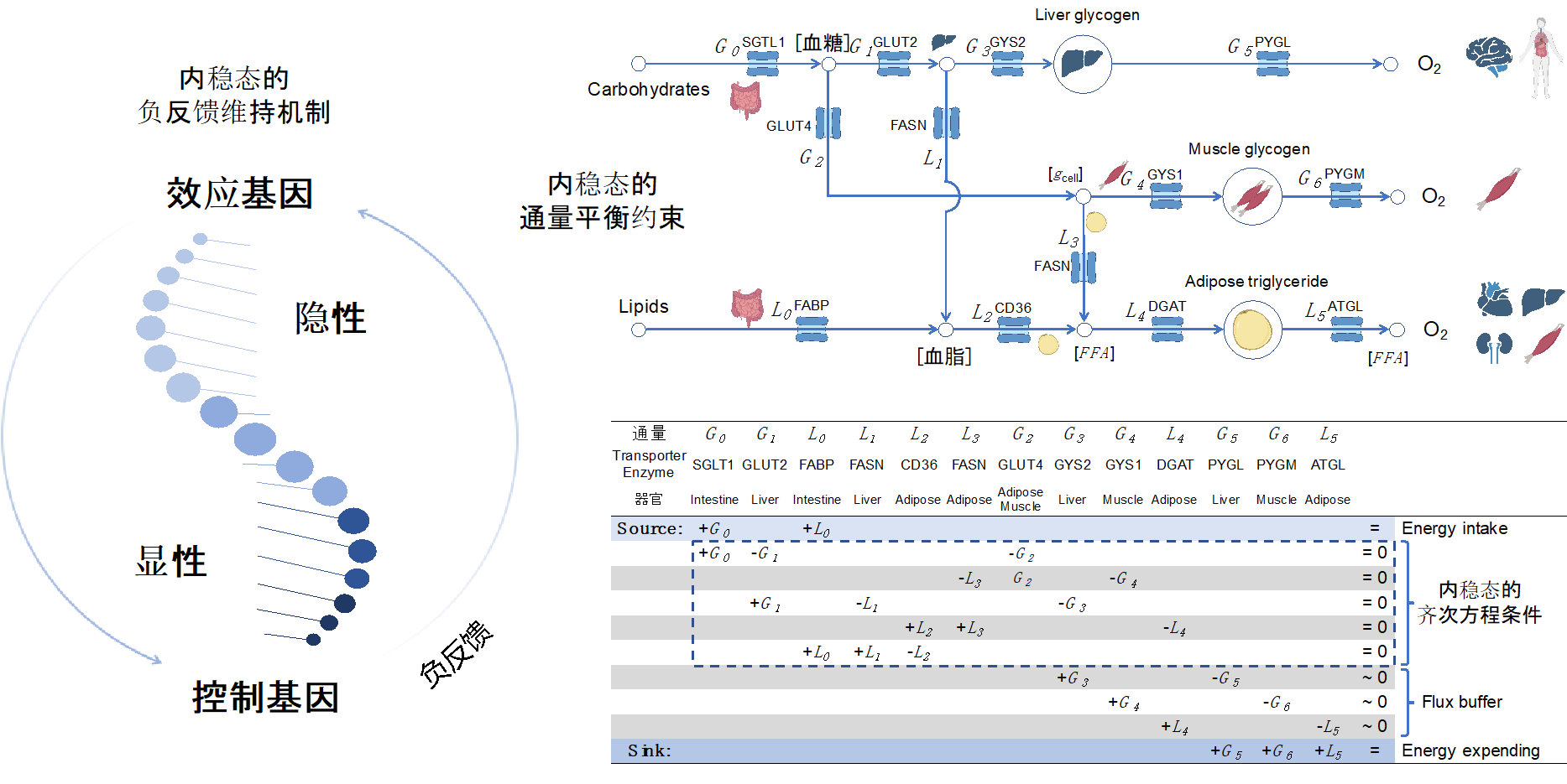 基因的劑量敏感性是判斷基因突變的顯隱性和遺傳疾病發(fā)病機(jī)制的關(guān)鍵依據(jù)。該項(xiàng)研究利用人群大數(shù)據(jù)首次在跨組織維度構(gòu)建了基因劑量敏感性度量,這一圖譜為判斷基因突變對(duì)人體健康的影響提供了系統(tǒng)性的參考。同時(shí),該研究揭示了孟德爾遺傳顯隱性和生命系統(tǒng)內(nèi)穩(wěn)態(tài)的聯(lián)系,并對(duì)疾病的干預(yù)和治療提出了相應(yīng)的啟示。以能量平衡為例,由于負(fù)反饋的機(jī)制,對(duì)效應(yīng)基因(如葡萄糖轉(zhuǎn)運(yùn)GLUT4/糖原合成GYS2/脂質(zhì)合成DGAT2)的劑量干預(yù)并不能影響系統(tǒng)的穩(wěn)態(tài)或糾正失衡狀態(tài)(即疾病狀態(tài)),對(duì)設(shè)定點(diǎn)(set-point)控制基因的干預(yù)(如葡萄糖感應(yīng)GCK/能量感應(yīng)AMPK/脂質(zhì)感應(yīng)PPAR)能干擾內(nèi)穩(wěn)態(tài)或糾正失衡狀態(tài)。