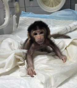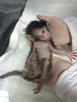 晚上八點鐘,外面一片漆黑,我們這些隨時待命的工作人員依然按照慣例巡查動物房。在飼養(yǎng)間里,大家借著月光看見了血跡,進一步觀察孕猴后,發(fā)現(xiàn)其陰道口已打開,這是早產(chǎn)的征兆。這種突發(fā)情況對于我們來說是常事,可是每一次我們都不敢怠慢。王燕、小紅師姐以及小李師兄等人立即開始商量對策,又給母猴做了B超等常規(guī)檢查。聽出小家伙的胎心正常,我們松了口氣,決定等待母猴自然分娩。但是直到午夜12點,母猴還未見任何生產(chǎn)跡象,我們的心又懸了起來。 ?????