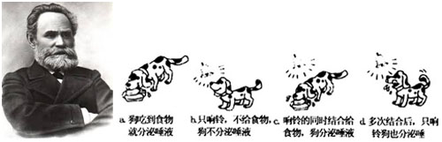 ? 巴普洛夫(1849—1936),俄國著名生理學(xué)家,高級神經(jīng)活動研究的奠基人之一。右側(cè)是他的經(jīng)典條件反射示意圖。?