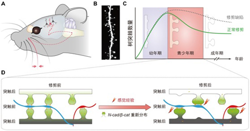 ??? 圖3:(A) 小鼠觸須接受到的感覺刺激傳入到軀體感覺皮層神經(jīng)元(虛線為其傳導(dǎo)途徑)。(B)軀體感覺皮層桶狀區(qū)域第2/3層錐體神經(jīng)元的樹突棘示例。(C) 軀體感覺皮層神經(jīng)元樹突棘數(shù)目在正常(綠色)和修剪缺陷(灰色)情況下隨年齡變化的趨勢。(D) Cadherin/catenin復(fù)合物介導(dǎo)樹突棘修剪的競爭模型:由感覺經(jīng)驗所帶來的神經(jīng)電活動增強導(dǎo)致相鄰樹突棘之間相互競爭胞內(nèi)的cadherin/catenin復(fù)合物,這一競爭導(dǎo)致后者在樹突棘之間的重新分布:獲得cadherin/catenin復(fù)合物較多的樹突棘得以存留、成熟,而失去該復(fù)合物的樹突棘則被修剪。