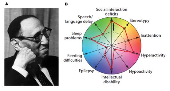 圖1(A) 首次對自閉癥做出臨床定義的Kanner醫(yī)生。(B)自閉癥患者的臨床表型 ???? ?