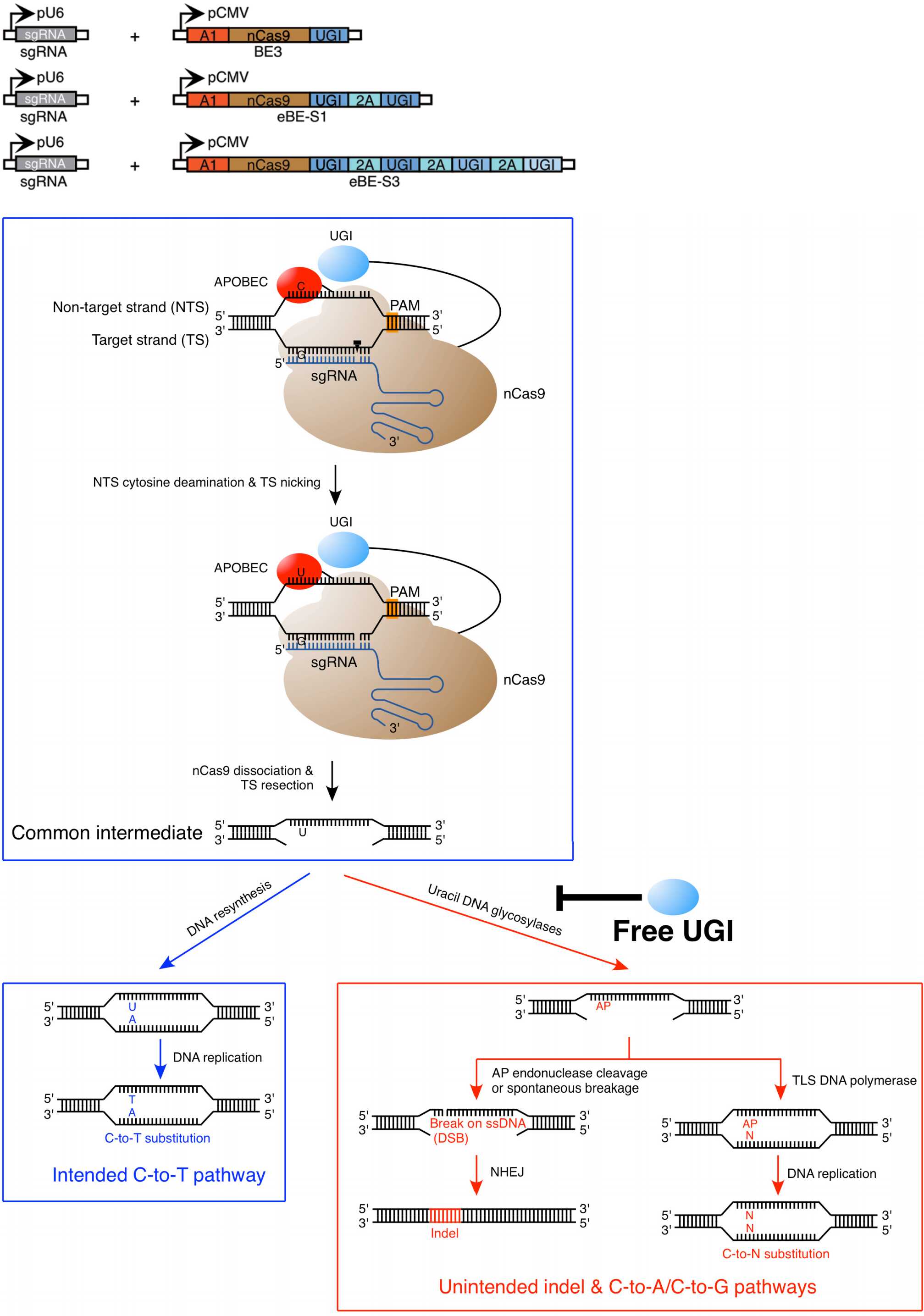 近年內(nèi)興起的CRISPR/Cas9基因編輯技術(shù)利用可設(shè)計(jì)的Cas9核酸酶通過堿基插入、缺失或替換等方式,對(duì)生物體基因組DNA特定片段進(jìn)行改造,進(jìn)而實(shí)現(xiàn)對(duì)靶基因的編輯。傳統(tǒng)的CRISPR/Cas9基因編輯技術(shù)雖然具有較高的基因敲除效率,但其在執(zhí)行堿基替換(對(duì)譬如基因突變進(jìn)行矯正)的效率通常很低,這也限制了CRISPR/Cas9基因編輯工具從科研向應(yīng)用的全面轉(zhuǎn)化。近期發(fā)展出的堿基編輯(base editing)系統(tǒng),由CRISPR/Cas9和APOBEC胞嘧啶脫氨酶兩個(gè)獨(dú)立的體系整合而成,可在基因組靶向位點(diǎn)實(shí)現(xiàn)由胞嘧啶(cytosine, C)向胸腺嘧啶(thymine, T)的編輯改造(Komor et al., Nature?2016)。其中,BE3雖然實(shí)現(xiàn)了較高的C至T編輯效率,但是也伴隨著較高水平的非目的性堿基插入或缺失(insertion/deletion, indel)和C至A或G的編輯副產(chǎn)物,這些都顯著地降低了堿基編輯器在基礎(chǔ)研究和臨床上的深入應(yīng)用。在這項(xiàng)最新的研究中,科研人員在前期對(duì)BE3導(dǎo)致非目的性突變機(jī)制探索的基礎(chǔ)上,利用共表達(dá)UGI的方法,成功開發(fā)出了增強(qiáng)型基因組堿基編輯器-eBE。利用多種UGI與BE3共表達(dá)的策略,eBE實(shí)現(xiàn)了更高精度和更高效率的堿基編輯,為堿基編輯技術(shù)在基礎(chǔ)研究及未來臨床領(lǐng)域的深入應(yīng)用提供了新方法和新思路。