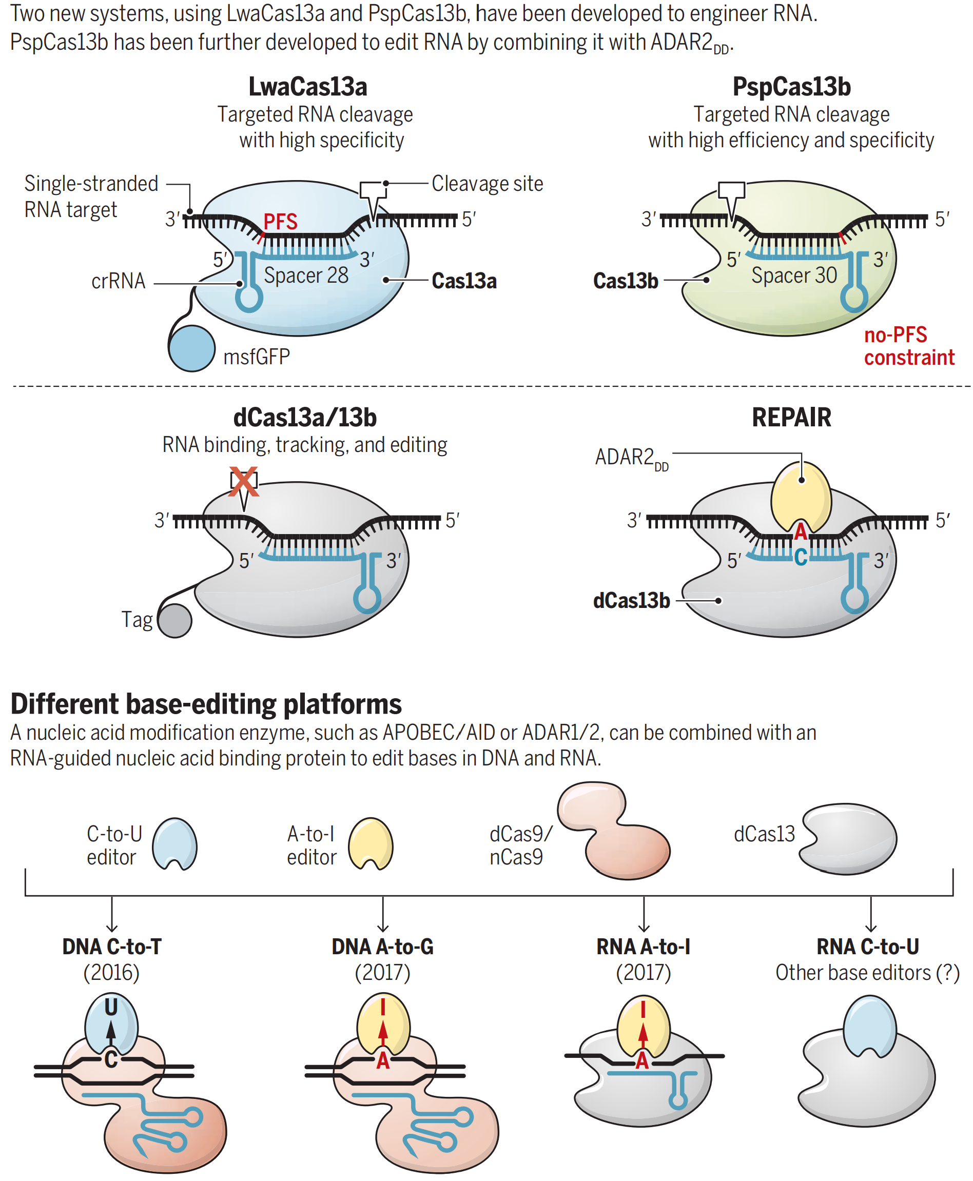 RNA水平的基因表達(dá)調(diào)控與生物體正常生理功能息息相關(guān),其異常變化則導(dǎo)致多種重要人類疾病的發(fā)生, 但是對RNA的改造操作手段則比較匱乏。來自Broad研究所的Feng Zhang教授研究組首先在Nature上報道了class 2 type VI CRISPR-Cas-Cas13a可對RNA分子進(jìn)行靶向切割,進(jìn)而實現(xiàn) RNA水平抑制基因表達(dá)的功能;而RNase失活改造的dCas13a則可以用于追蹤內(nèi)源RNA分子的細(xì)胞定位研究等。在當(dāng)期Science,F(xiàn)eng Zhang教授研究組進(jìn)一步篩選了多種class 2 type VI CRISPR-Cas系統(tǒng)(包括Cas13a、Cas13b和Cas13c),展示了來自Prevotella sp.的Cas13b(PspCas13b)具有最優(yōu)的RNA靶向切割效應(yīng),其比RNAi系統(tǒng)具有更好的專一性和更低的脫靶效應(yīng);研究人員進(jìn)一步將RNase失活改造的dCas13b與A-to-I RNA編輯酶ADAR偶聯(lián)(REPAIR系統(tǒng)),實現(xiàn)了在RNA水平上的A-to-I/G單堿基編輯(base editing)。來自Harvard大學(xué)的David Liu教授研究組在2016和2017年分別報道了DNA水平的C-to-T 和A-to-G單堿基編輯。相對于DNA水平的單堿基編輯,RNA水平的單堿基編輯避免了任何由于對遺傳基因組DNA操作所引發(fā)的脫靶效應(yīng)的擔(dān)憂。由于RNA在細(xì)胞內(nèi)的豐度和結(jié)構(gòu)都千差萬別,REPAIR系統(tǒng)介導(dǎo)的RNA單堿基編輯會因RNA不同而異。當(dāng)然,DNA和RNA水平的單堿基編輯為基因編輯改造以治療疾病又提供了多種可供選擇的高效手段。