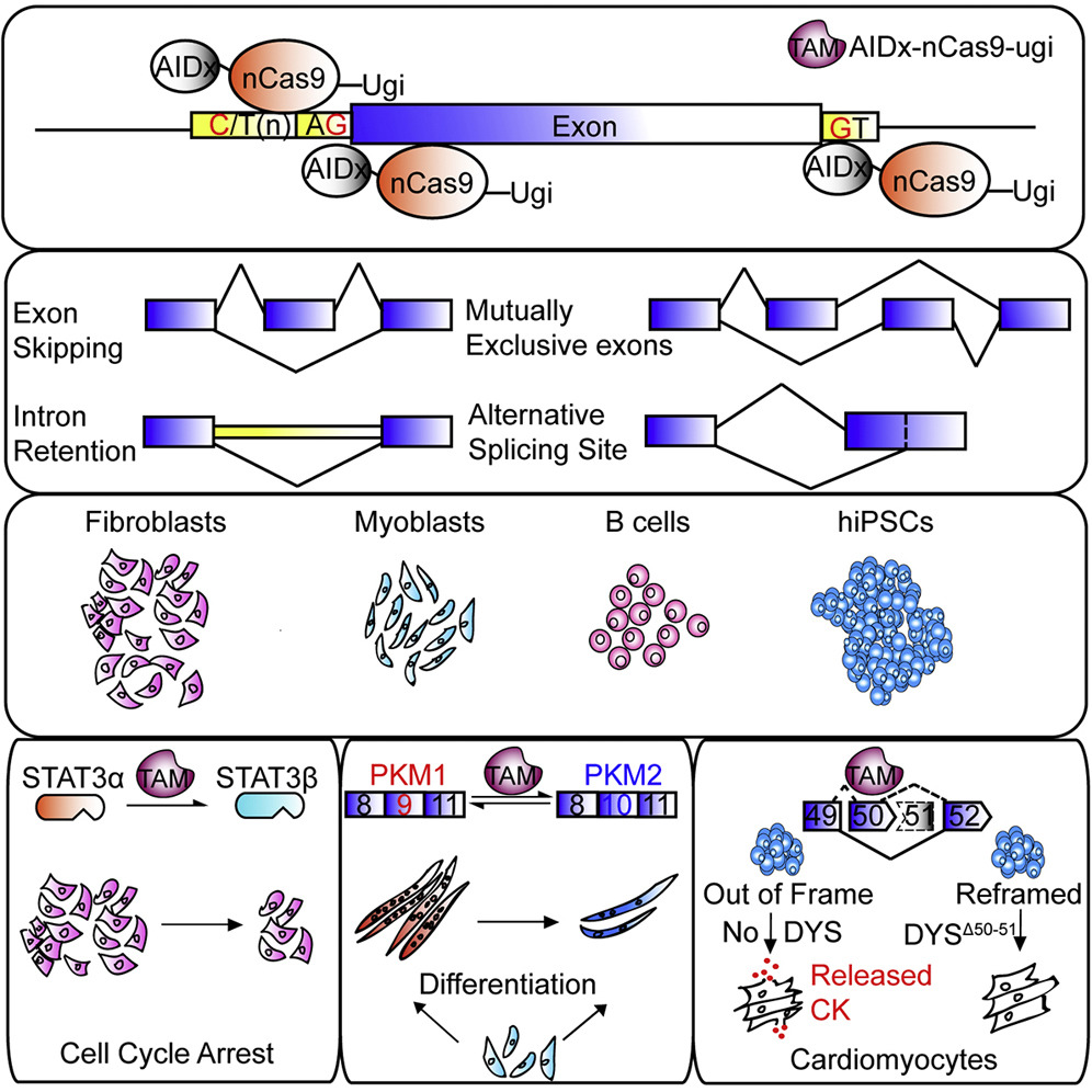 在這一新研究中,博士研究生袁娟娟和馬云青首先注意到,98%以上的內(nèi)含子有保守的GU(內(nèi)含子開始)和AG(內(nèi)含子末尾)序列,推測如果可以高效精確的將G突變成A, 可以特異性阻斷外顯子識別,調(diào)控內(nèi)源性mRNA的剪切。通過這一策略,利用TAM誘導(dǎo)剪接位點DNA上G>A突變,就可以誘導(dǎo)可變外顯子(alternative exon)及組成性外顯子(constitutive exon)的跳讀(Exon skipping);改變可變剪接位點的選擇(Alternative splice site);調(diào)節(jié)互斥外顯子的選擇(mutually exclusive exons);誘導(dǎo)小的內(nèi)含子的包含(intron retention)。此外,如果通過TAM將3'剪接位點上游polypyrimidine track中包含的C向T突變,可以促進下游外顯子的包含。因此,利用TAM可以成功的實現(xiàn)針對RNA剪接的“l(fā)oss of function”和”gain of function”調(diào)控。