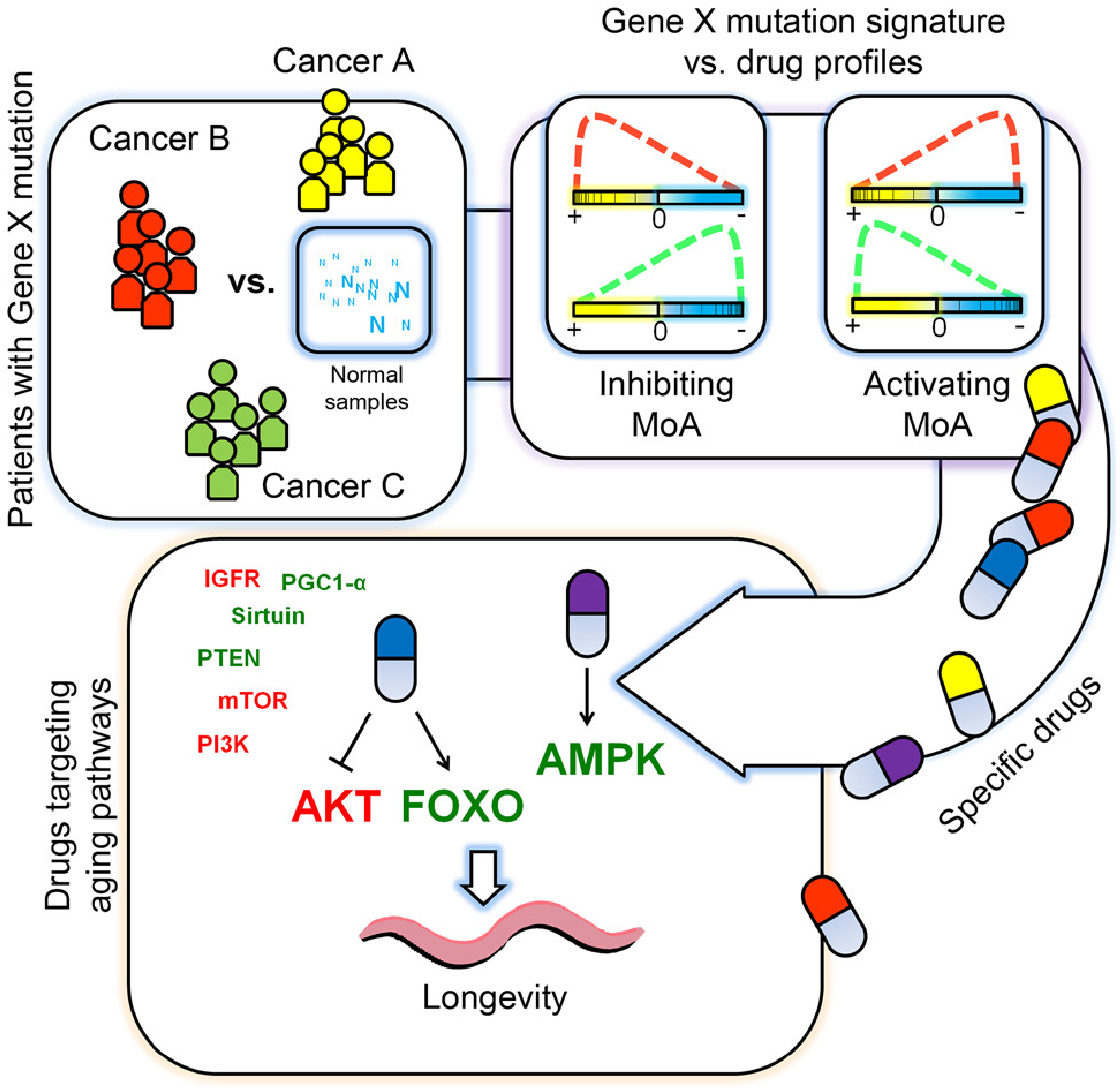 針對藥物重定位的大規(guī)模實(shí)驗(yàn)篩選常常被局限在基于體外細(xì)胞或非人模式動(dòng)物的環(huán)境下進(jìn)行,缺少對真實(shí)人體情況的反映?;诩?xì)胞實(shí)驗(yàn)的篩選結(jié)果通常帶有細(xì)胞系特異性,而且所能研究的靶點(diǎn)數(shù)目有限。在該研究中,研究人員構(gòu)建了基于人體內(nèi)環(huán)境的無細(xì)胞或組織特異性偏好的高通量藥物靶基因的計(jì)算篩選方法,從TCGA癌癥數(shù)據(jù)庫中提取了8476個(gè)人類編碼基因的單基因突變的、非組織特異性的“轉(zhuǎn)錄組核心標(biāo)簽”并將癌癥背景予以去除,從而構(gòu)建了全基因組水平的單基因靶點(diǎn)的篩選體系;并開發(fā)了“核心標(biāo)簽-藥物-基因相互作用”(core-signature Drug-to-Gene,?csD2G)算法,用這8476個(gè)轉(zhuǎn)錄組核心標(biāo)簽分別掃描3546個(gè)藥物處理轉(zhuǎn)錄組標(biāo)簽來預(yù)測藥物重定位新靶點(diǎn),并且構(gòu)建藥物-靶點(diǎn)特異性評估體系,為1938個(gè)藥物和3758個(gè)基因篩選出179004個(gè)高特異性的藥物-基因靶向關(guān)系。在靶點(diǎn)預(yù)測的覆蓋率和特異性上,csD2G優(yōu)于體外細(xì)胞實(shí)驗(yàn)基因干擾標(biāo)簽、L1000實(shí)驗(yàn)標(biāo)簽的藥物-靶點(diǎn)預(yù)測、以及現(xiàn)存的藥物重定位算法。研究人員隨后將該方法擴(kuò)展到三方面研究予以應(yīng)用:1)重定位一類抗精神病藥物(吩噻嗪)去抑制TGF-β信號通路;2)重定位一類降血壓藥(鈣離子通道拮抗劑)去激活A(yù)MPK、抑制AKT信號通路,并用臨床電子病歷驗(yàn)證;3)重定位并功能驗(yàn)證7個(gè)藥物去特異選擇性地靶向AKT-FOXO及AMPK通路,并延長線蟲壽命。