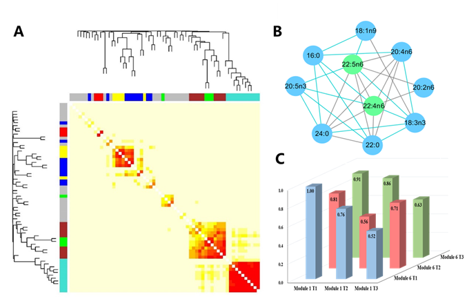 (A)網(wǎng)絡(luò)分析熱圖;(B)長鏈n-6PUFA模塊的子網(wǎng)絡(luò)示意圖;(C)長鏈n-6PUFA模塊(模塊1)與短-中鏈?;鈮A模塊(模塊6)對代謝綜合征發(fā)病的交互作用