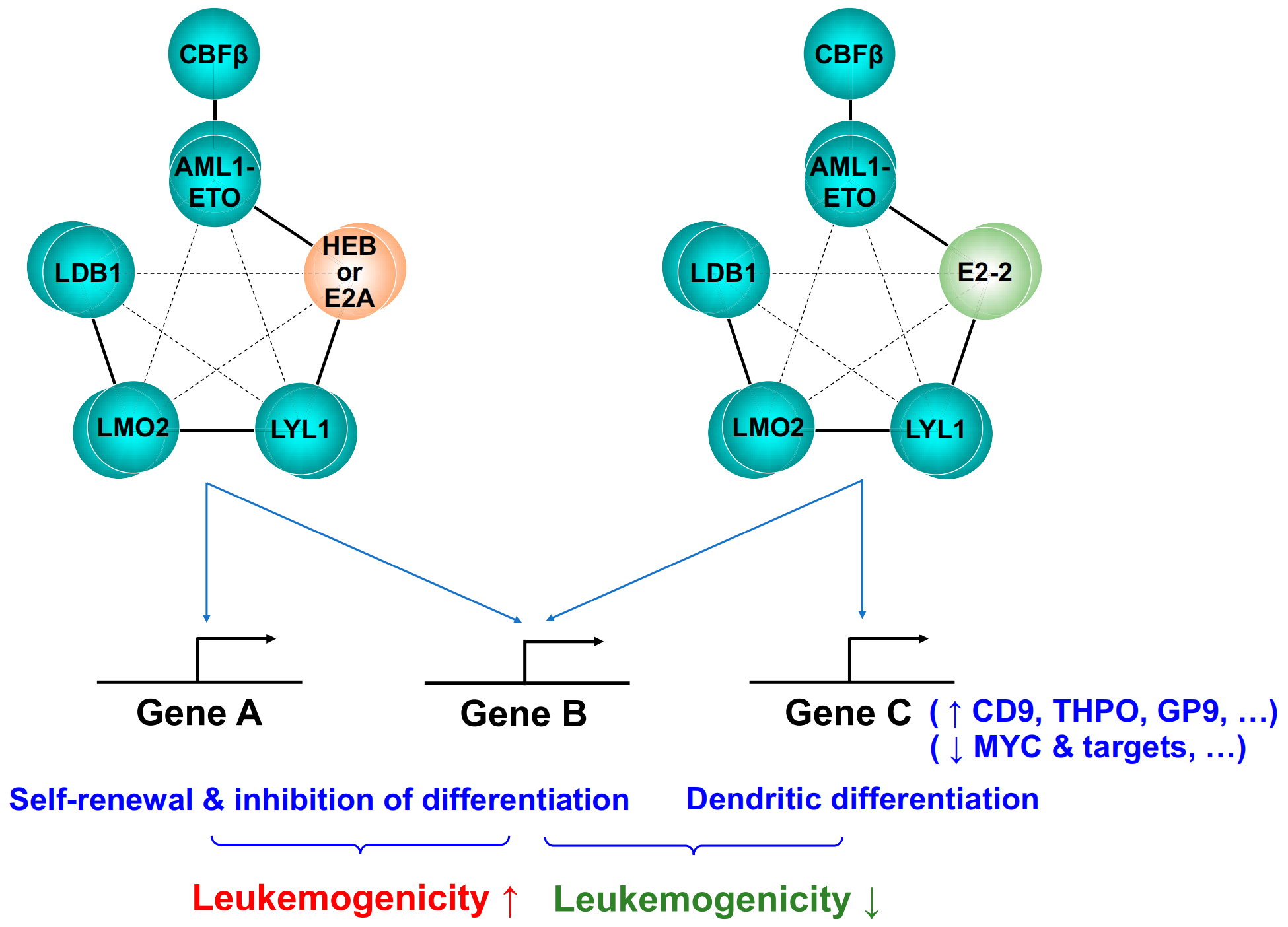 圖:E蛋白家族成員HEB, E2A和E2-2在白血病發(fā)生過(guò)程中所扮演的不同角色式。