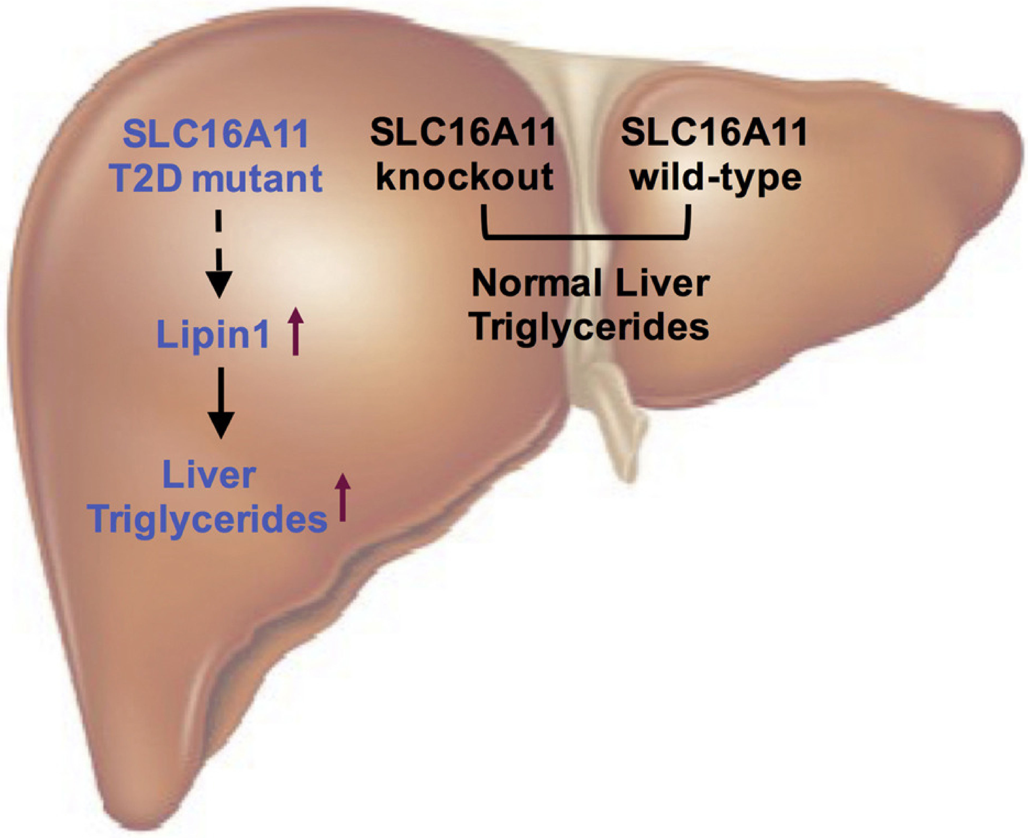 圖注:研究發(fā)現(xiàn)SLC16A11編碼區(qū)的2型糖尿病易感突變會(huì)產(chǎn)生功能獲得性突變蛋白,導(dǎo)致肝臟Lipin1蛋白表達(dá)上調(diào),脂滴不正常積累增多,進(jìn)而導(dǎo)致2型糖尿病的發(fā)生。
