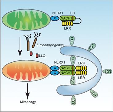 圖注:李斯特菌通過其分泌的毒素蛋白LLO誘導(dǎo)線粒體損傷,促進(jìn)NLRX1發(fā)生多聚化并與自噬蛋白LC3結(jié)合進(jìn)而促進(jìn)線粒體自噬通路的激活。