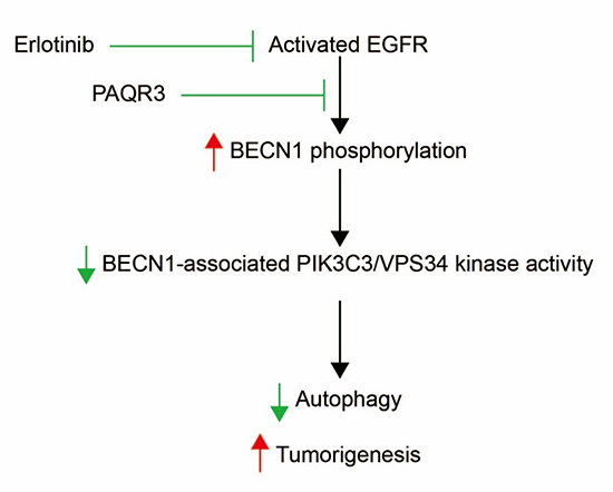 中國科學(xué)院上海營養(yǎng)與健康研究所陳雁課題組曹倩倩博士生等經(jīng)過研究發(fā)現(xiàn)孕酮和脂聯(lián)素受體3(PAQR3)調(diào)控NSCLC細(xì)胞自噬和增殖的新機制。PAQR3作為抑癌基因,在多種人類癌癥中表達(dá)降低。在這項研究中,研究人員在細(xì)胞和動物水平發(fā)現(xiàn)PAQR3抑制多種NSCLC細(xì)胞的生長。同時,發(fā)現(xiàn)PAQR3作為重要的自噬調(diào)節(jié)蛋白能夠促進厄洛替尼誘導(dǎo)的NSCLC細(xì)胞自噬的發(fā)生。進一步的機制探索發(fā)現(xiàn)抑制自噬可以完全阻斷PAQR3對NSCLC細(xì)胞增殖的抑制作用,表明自噬是介導(dǎo)PAQR3抗腫瘤作用的關(guān)鍵節(jié)點。因此,該研究首次揭示了PAQR3對小細(xì)胞肺癌的抑瘤活性依賴于細(xì)胞自噬。在臨床實踐中,厄洛替尼或吉非替尼可用于NSCLC的治療,基于PAQR3調(diào)控肺癌細(xì)胞自噬的這一特征,調(diào)控PAQR3的功能有可能增強這些藥物的抗腫瘤活性。