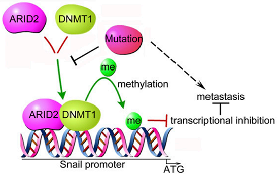 博士后姜浩在謝東研究員的指導(dǎo)下,發(fā)現(xiàn)ARID2在轉(zhuǎn)移的肝癌組織中表達(dá)顯著下調(diào),并和腫瘤的病理分級(jí)、器官轉(zhuǎn)移呈負(fù)相關(guān),與肝癌患者的生存時(shí)間呈正相關(guān)。ARID2抑制肝癌細(xì)胞體外的遷移和侵潤(rùn),以及體內(nèi)的轉(zhuǎn)移。在多種肝癌小鼠模型中,ARID2敲除都促進(jìn)了肝癌細(xì)胞的肺轉(zhuǎn)移。機(jī)制研究揭示ARID2招募DNMT1至Snail的啟動(dòng)子區(qū)域,增強(qiáng)了啟動(dòng)子的甲基化,抑制了Snail的轉(zhuǎn)錄,從而抑制了肝癌細(xì)胞的上皮間充質(zhì)轉(zhuǎn)化。此外,C2H2結(jié)構(gòu)域遭到破壞的ARID2突變體失去了轉(zhuǎn)移抑制分子的能力,并和肝癌患者的轉(zhuǎn)移及不良預(yù)后呈正相關(guān)。