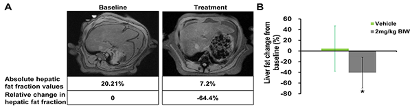 符合入選標(biāo)準(zhǔn)的肥胖食蟹猴接受B1344治療或?qū)φ仗幚恚?9天通過磁共振成像(MRI)測定肝臟脂肪。(A)經(jīng)每周兩次給予2 mg/kg B1344治療后的猴子肝臟脂肪含量的MRI測量結(jié)果;(B)經(jīng)每周兩次給予2 mg/kg B1344治療后的猴子肝臟脂肪含量的定量測定結(jié)果。