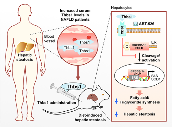 循環(huán)中的Thbs1蛋白水平隨著肝臟脂肪含量的增加而代償性增加。外源給予Thbs1蛋白可以改善飲食誘導(dǎo)的小鼠肝臟脂質(zhì)沉積,這種改善作用是通過Thbs1-CD36-SREBP-1信號軸抑制肝細胞脂質(zhì)合成途徑實現(xiàn)的。Thbs1及其多肽類似物可能是非酒精性脂肪肝的潛在治療靶標。