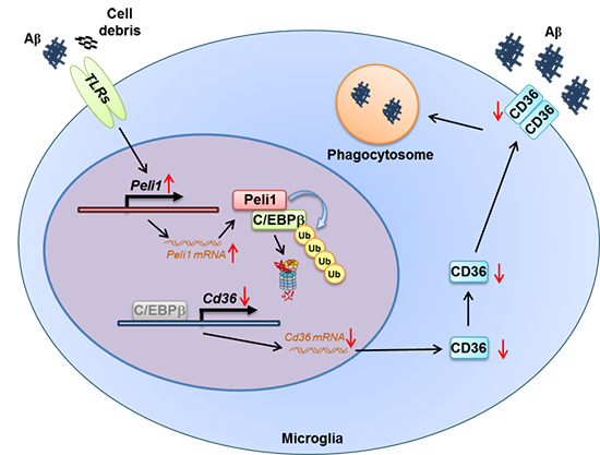 在先前的研究中,肖意傳研究組的科研人員發(fā)現(xiàn)Peli1在小膠質(zhì)細(xì)胞中特異性高表達(dá),并介導(dǎo)調(diào)節(jié)自身免疫性神經(jīng)炎癥、帕金森氏?。≒arkinson's Disease, PD)和病毒性腦炎的發(fā)生發(fā)展。本研究進(jìn)一步明確了Peli1在另一種常見神經(jīng)退行性疾病AD中通過負(fù)調(diào)控小膠質(zhì)細(xì)胞對Aβ的吞噬能力,致使腦部大量Aβ沉積無法被清除,從而造成AD病情惡化的病理機(jī)制。機(jī)制研究表明,Peli1直接結(jié)合并介導(dǎo)轉(zhuǎn)錄因子C/EBPβ的泛素化及降解,由于C/EBPβ是清道夫受體CD36的關(guān)鍵轉(zhuǎn)錄因子,故Peli1敲除后顯著促進(jìn)了CD36基因的表達(dá),由此增強(qiáng)了小膠質(zhì)細(xì)胞對Aβ的吞噬作用。因此,在老年P(guān)eli1基因缺失的5×FAD轉(zhuǎn)基因AD模型小鼠腦內(nèi),小膠質(zhì)細(xì)胞對Aβ的清除作用顯著增強(qiáng),由此抑制了Aβ在腦部的沉積。此外,在5×FAD小鼠腦部小膠質(zhì)細(xì)胞和AD病人腦組織中,Peli1的表達(dá)較正常對照明顯升高,提示AD病理會誘導(dǎo)小膠質(zhì)細(xì)胞中Peli1的表達(dá)。因此,小膠質(zhì)細(xì)胞中Peli1是AD診治的一個潛在新分子靶標(biāo)。