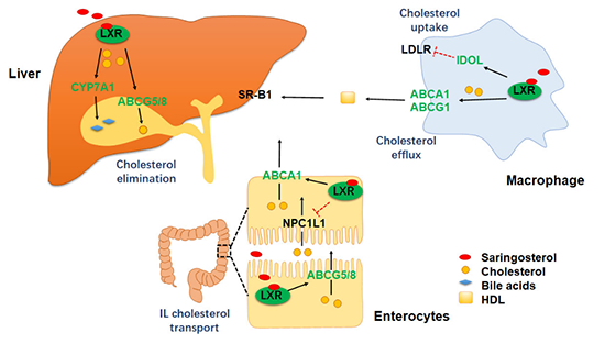 羊棲菜是一種常見的可食用褐藻,具有多種生物活性,如抵抗肥胖等。研究組前期研究發(fā)現(xiàn),從羊棲菜中提取的馬尾藻甾醇,在體外可以選擇性激活LXRβ,可能是一種天然的降膽固醇的藥物(JAFC 2014 Jul 2;62(26):6130-6137)。在本研究中,研究人員通過高脂喂養(yǎng)的ApoE-/-小鼠構建動脈粥樣硬化模型,研究結果顯示馬尾藻甾醇干預能夠有效緩解動脈粥樣硬化,降低血清膽固醇水平,同時,不會引起肝臟脂肪變性的不良反應。進一步研究發(fā)現(xiàn),馬尾藻甾醇可以調(diào)節(jié)肝臟,小腸及巨噬細胞中LXR的靶基因的表達,促進巨噬細胞膽固醇外排和抑制膽固醇的攝取,促進肝臟中膽固醇分解代謝和分泌,減少腸內(nèi)膽固醇的吸收以及外排。綜上所述,該研究表明馬尾藻甾醇對LXRβ的激活具有選擇性,能夠降低血清膽固醇水平和抗動脈粥樣硬化,為預防動脈粥樣硬化提供新的策略。