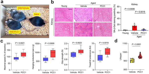 研究人員隨后在多種小鼠模型中論證PCC1清除體內(nèi)衰老細胞的有效性和安全性,結果證明在自然衰老的老年小鼠模型中,PCC1能清除老年小鼠多種組織器官類型中的衰老細胞,增強小鼠生理機能并延長老年小鼠壽命。