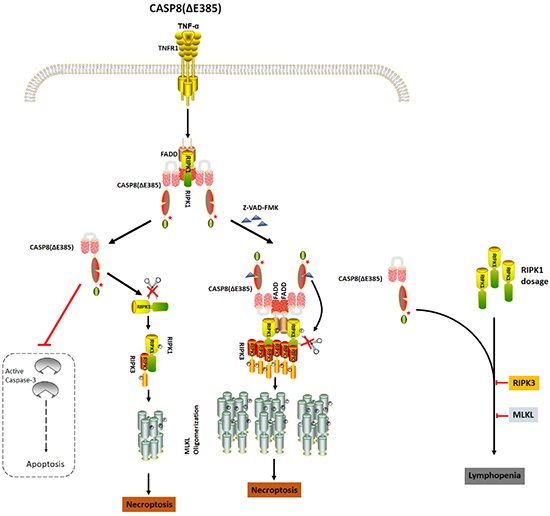 圖:Caspase-8蛋白通過自我剪切調(diào)控細(xì)胞死亡及促進(jìn)免疫缺陷疾病的作用模式圖